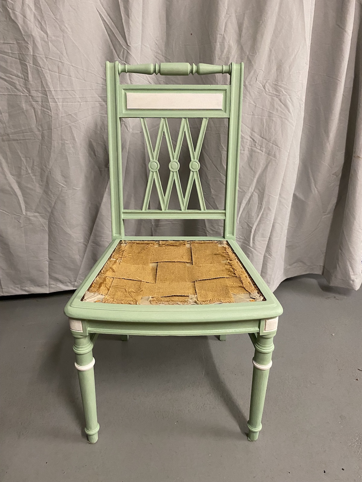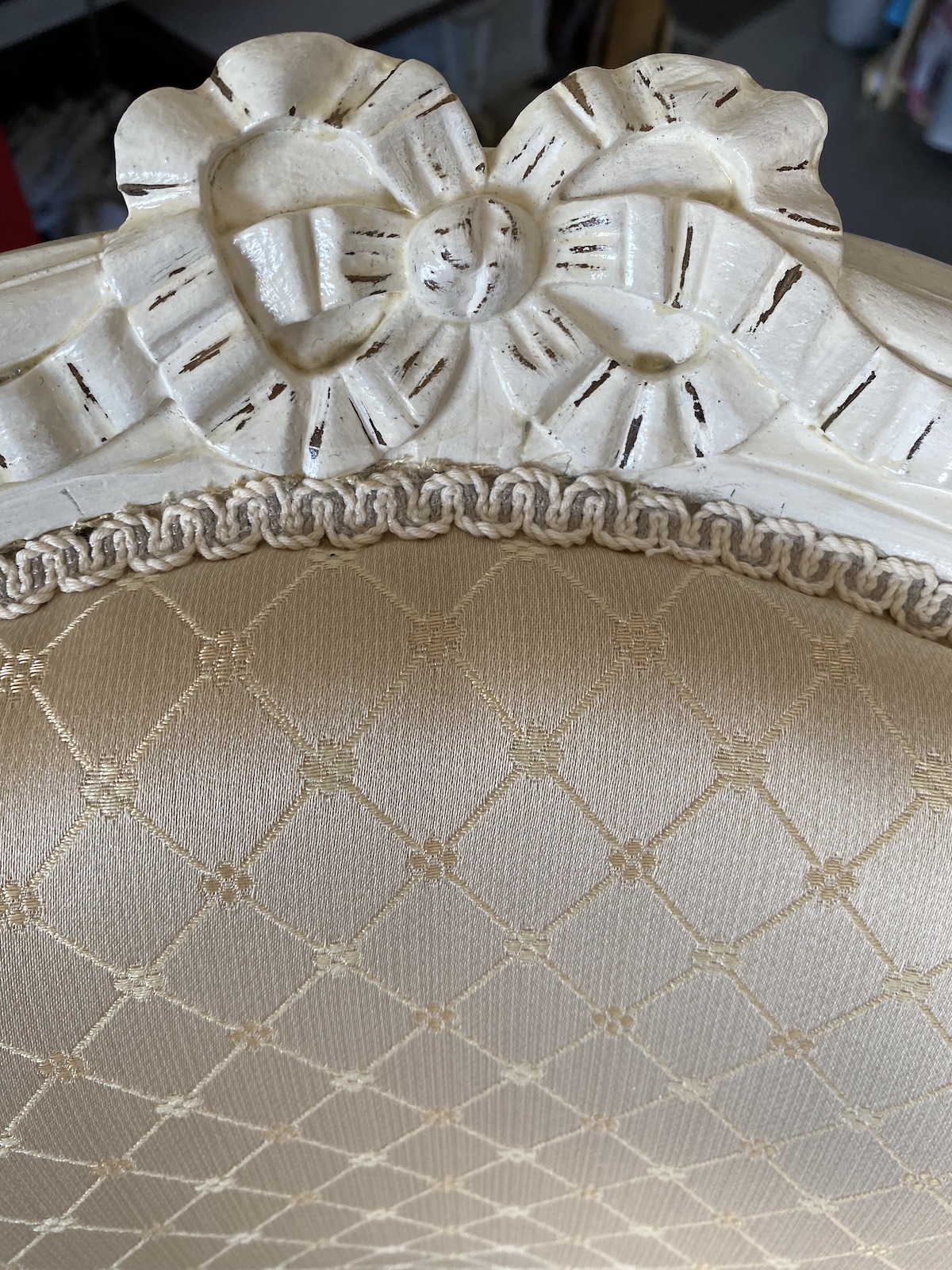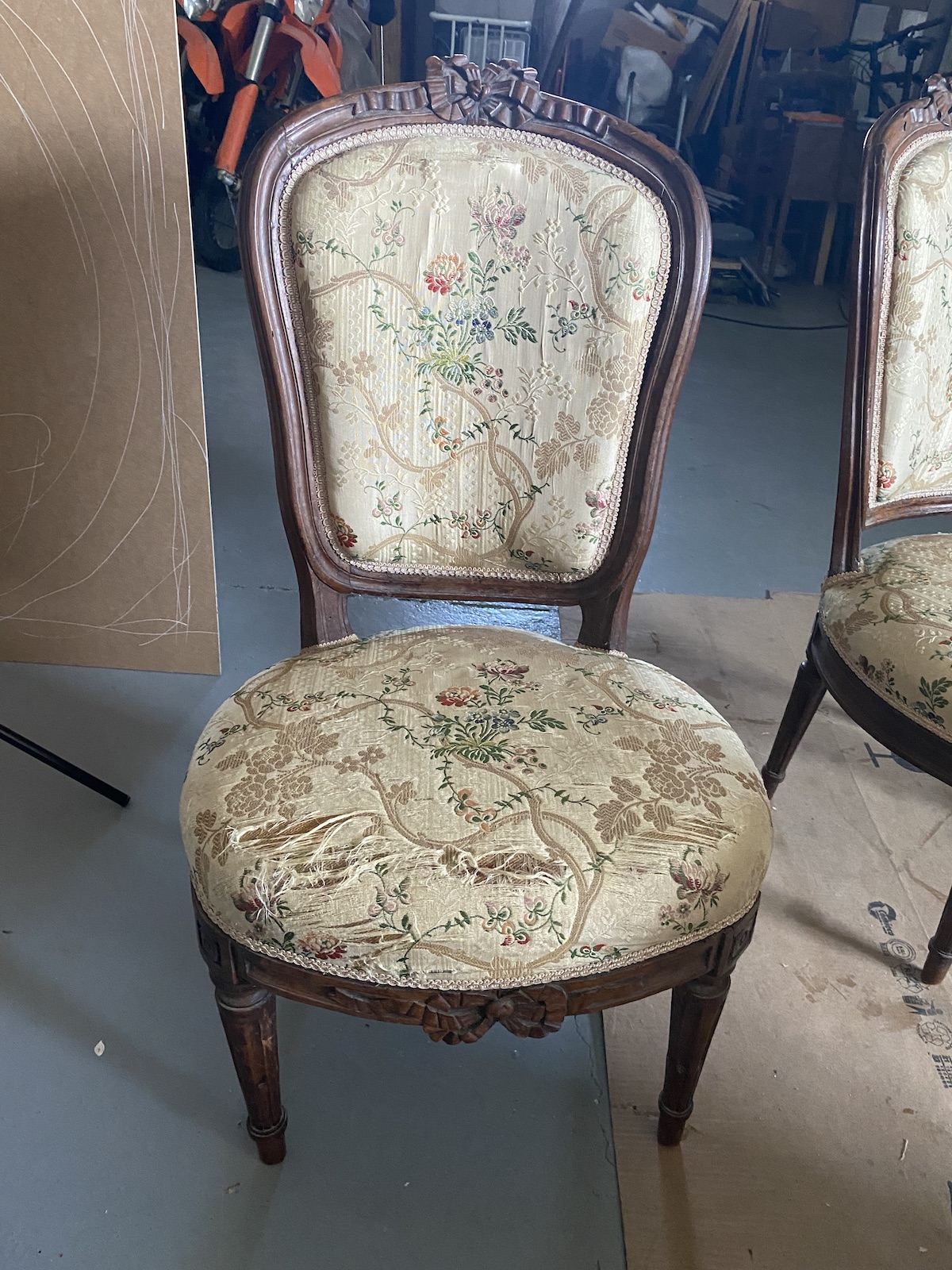 Restauration de trois chaises modèle Médaillon. Tissu de luxe italien. Peinture avec un effet usé.