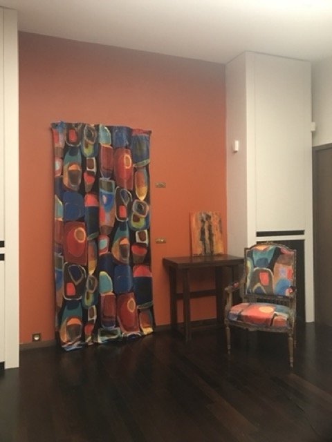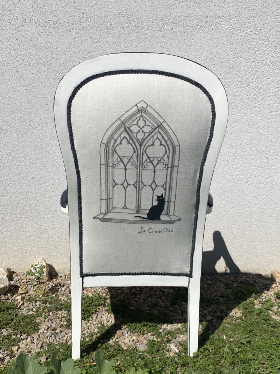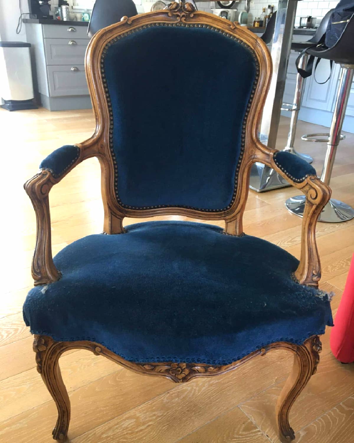 Restauration de trois chaises modèle Médaillon. Tissu de luxe italien. Peinture avec un effet usé.