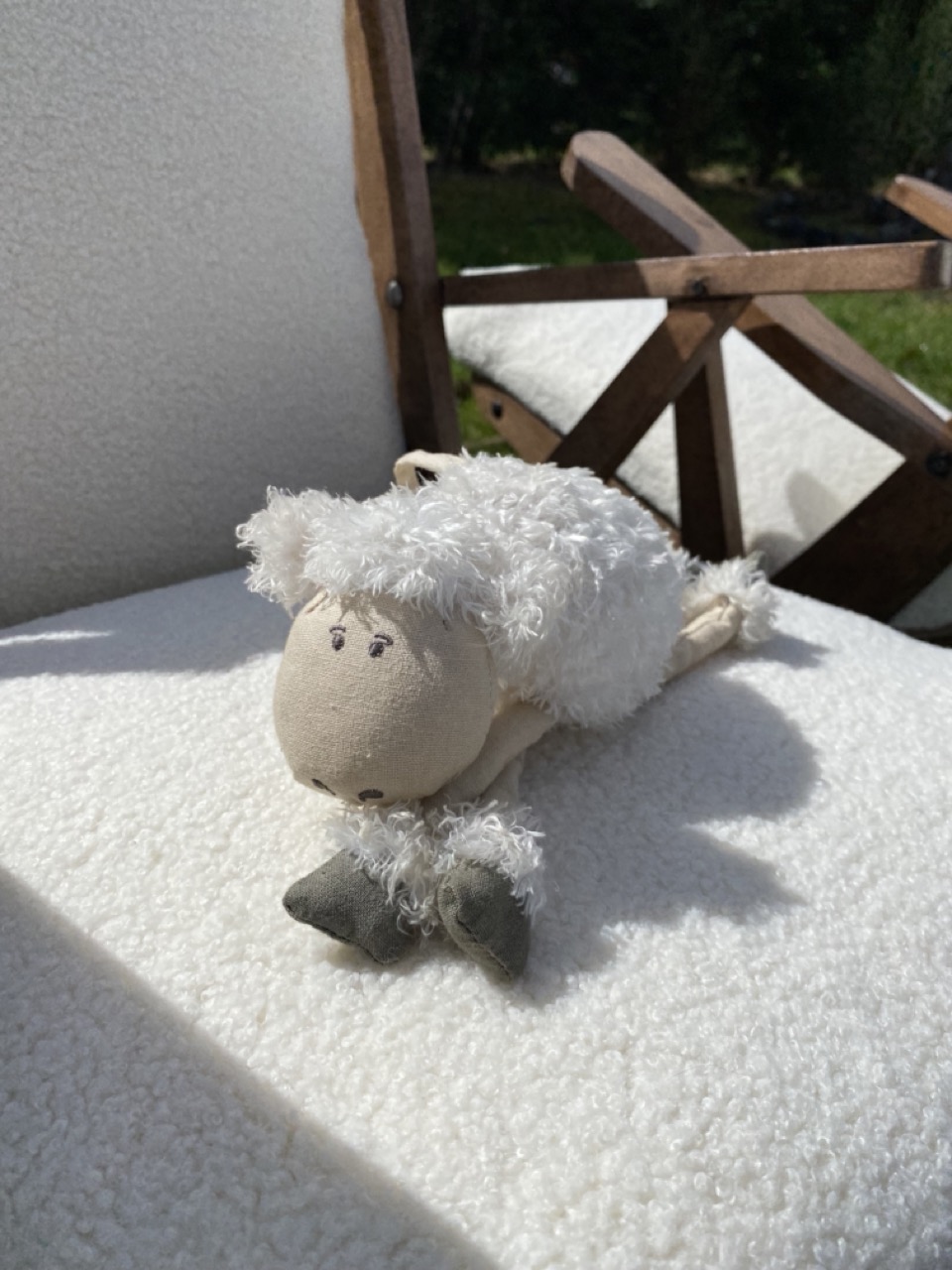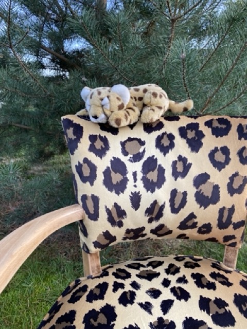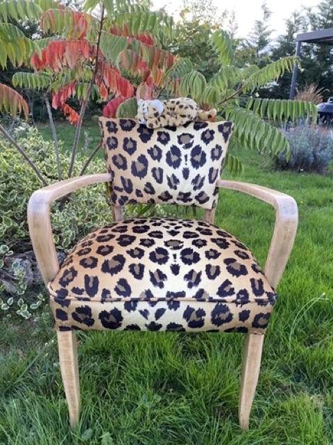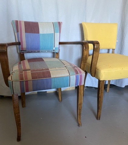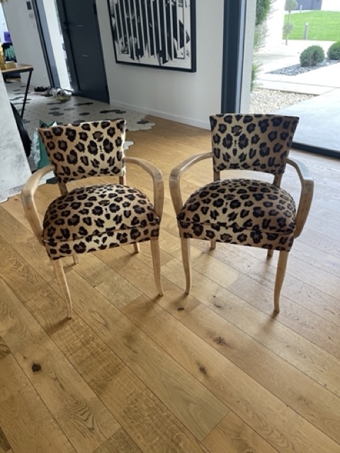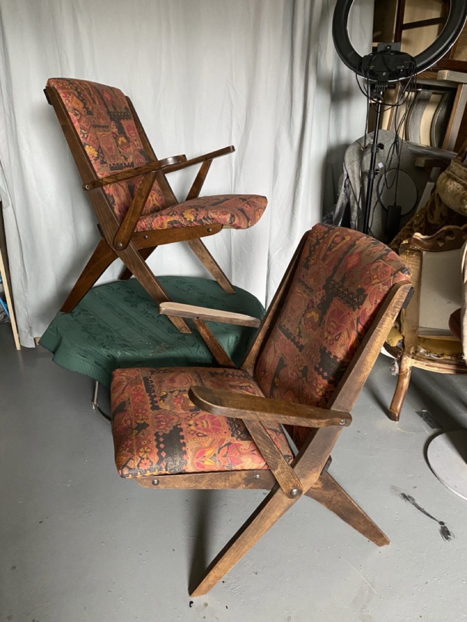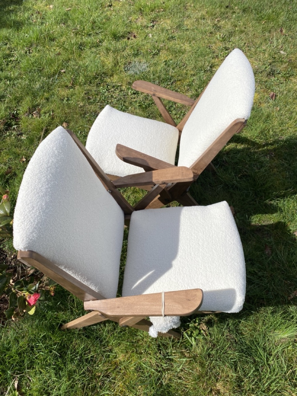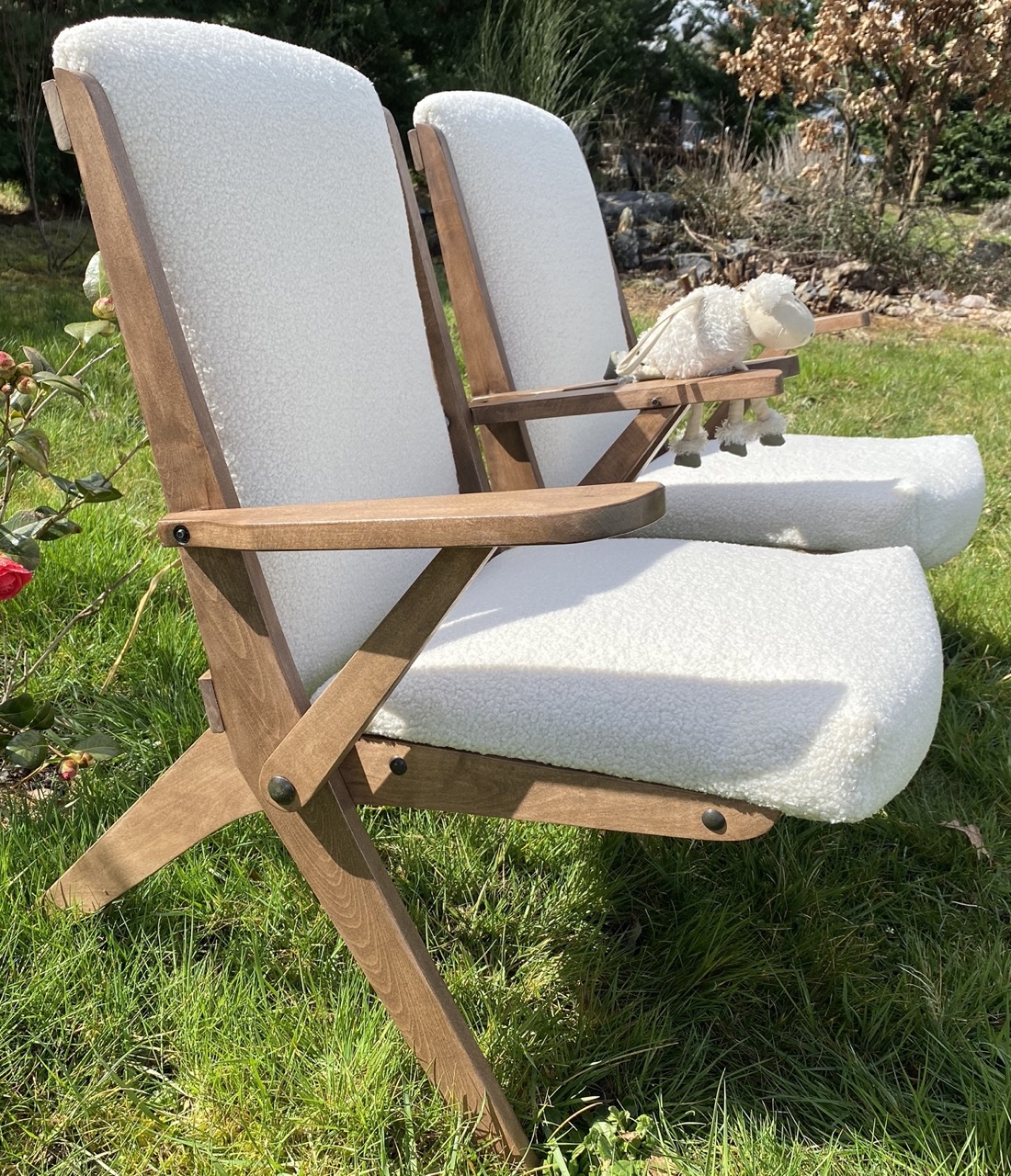 Relooking de deux chaises pliantes, revêtement en tissu bouclé du fabricant espagnol FROCA. Bois poncé, teinté, vernis satiné.