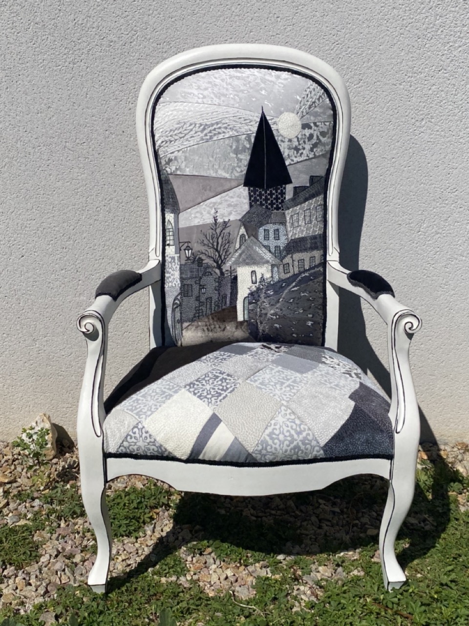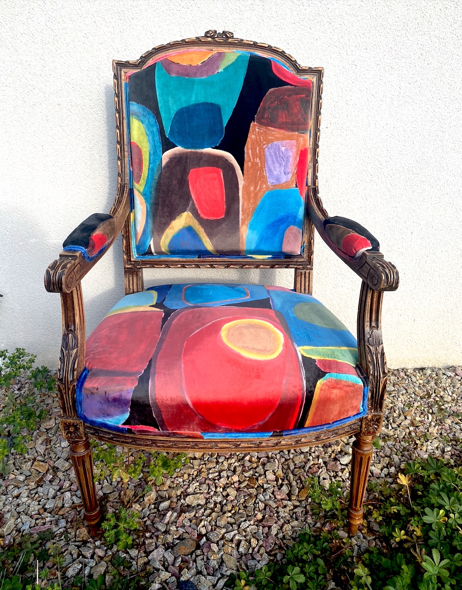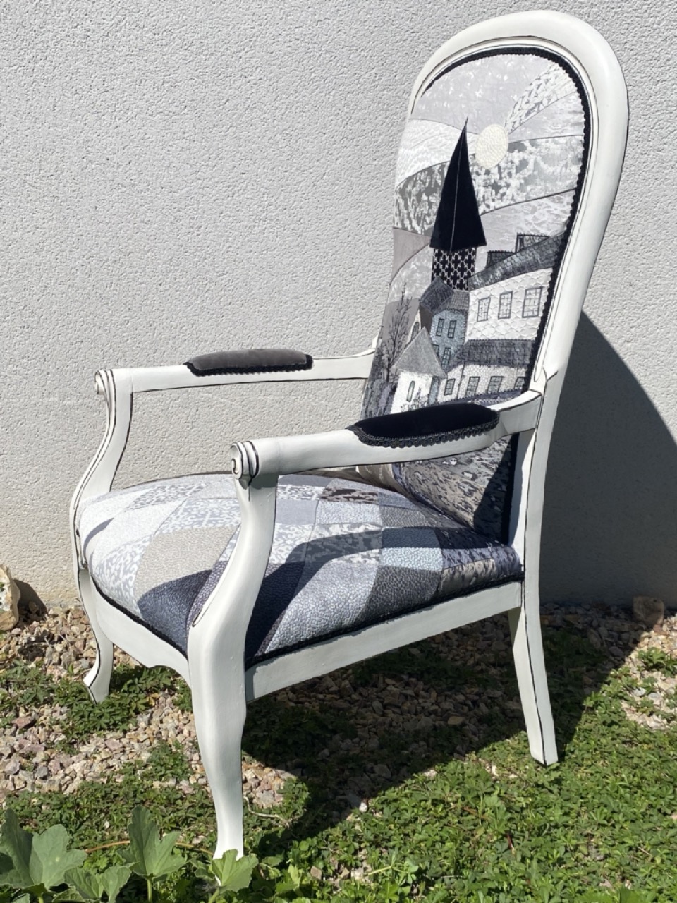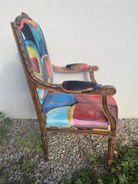 Fauteuil modèle Voltaire, le revêtement est réalisé en tissus de luxe en techniques mixtes, patchwork, broderie, peint à la main. Le bois est recouvert de peinture acrylique et protégé par un vernis satiné.